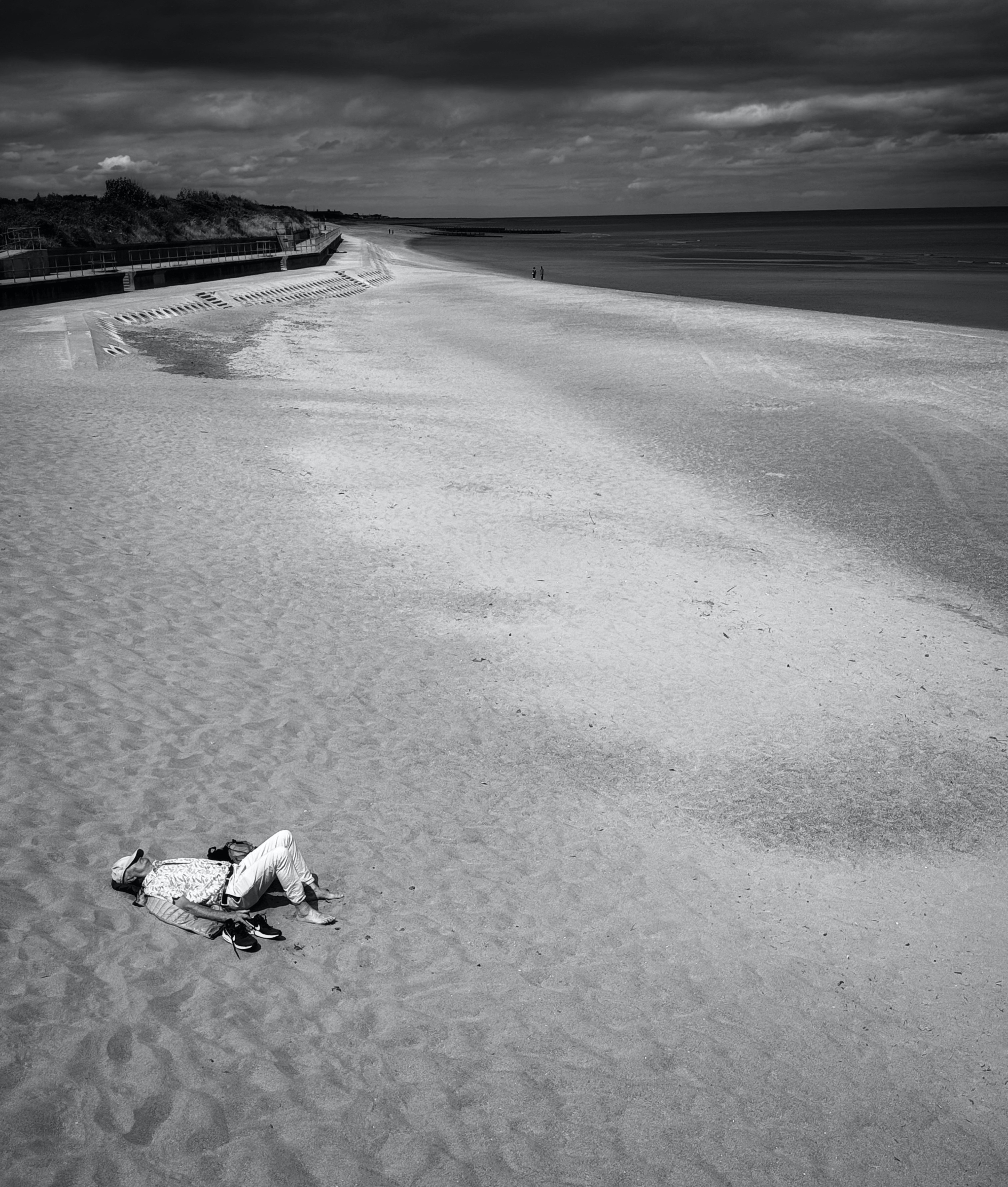 I stopped and looked over the edge and caught this scene. Alone on the vastness of the beach, hosting the sun, a hat shielding his (her?) eyes, the sands stretching away, deserted, into the lost horizon, oblivious to everything.