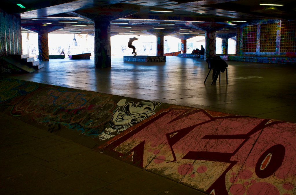 There’s a place on the South Bank in London, just near the National Theatre where the skate-boarders go. It’s nearly always busy, every inch decorated by graffiti. The day I went a man was over-painting a wall – tattoos, straggly hair, low slung trousers, numerous spray cans at his feet.