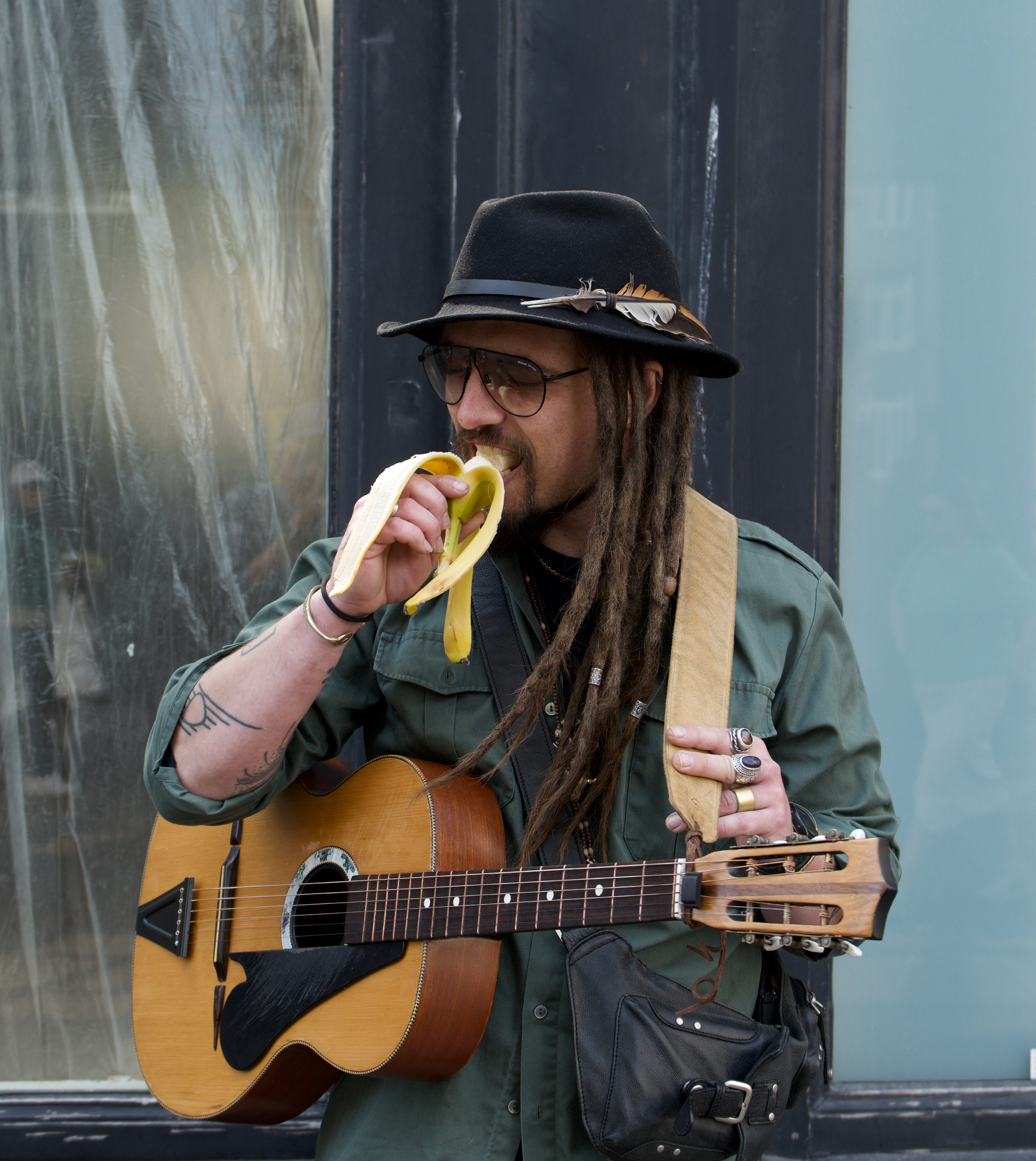 I saw this street musician setting up, guitar at the ready, a last energy giving banana clutched like a pick in his hand. I quickly raised my Leica D Lux 8 and sneaked a frame. He saw me and we smiled, me weakly, he open and friendly.