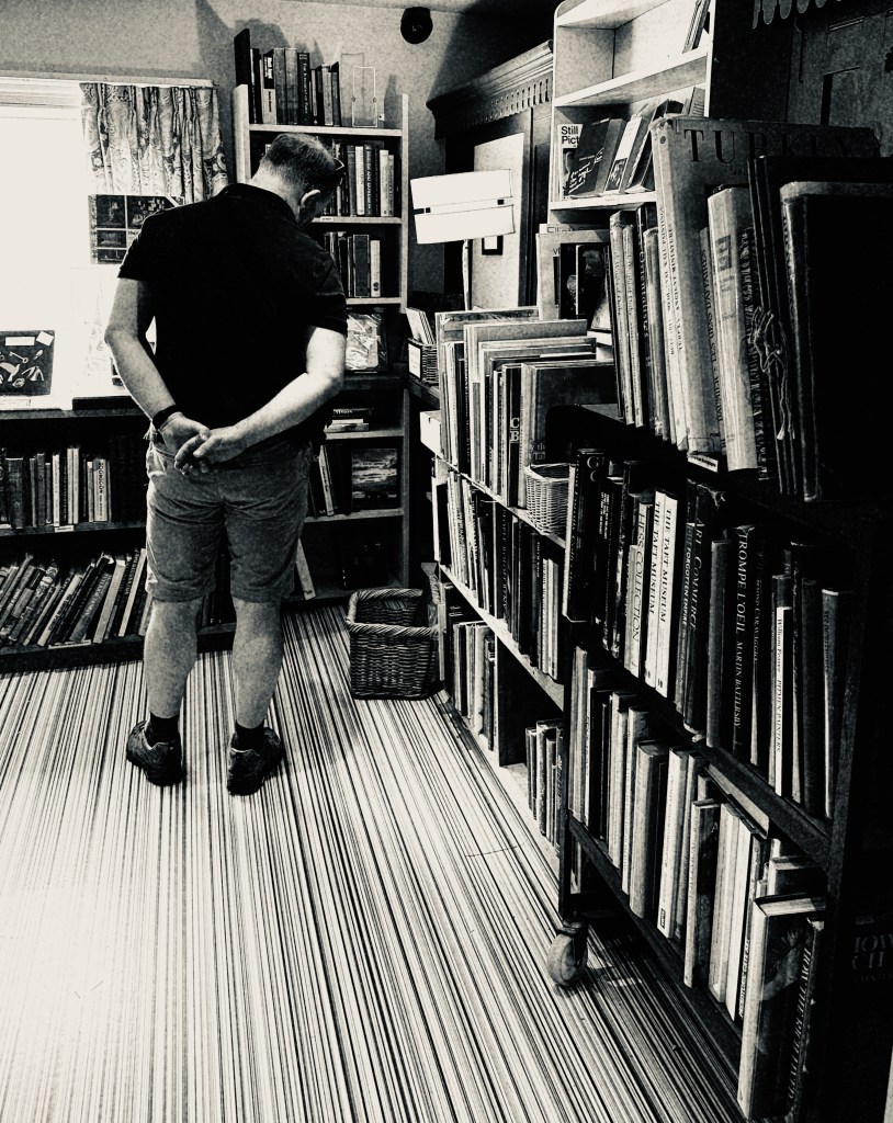 There’s nothing particularly special about this photo – an iPhone was used because I had it, not a Leica Q3 or a Fuji X100 Vl, a 100 megapixel Hasselblad or some dusty lovingly preserved film stock. It’s a snap but it’s a moment any photographer or book lover would recognise – a back view, head lowered and bent to one side to better read the spines, hands clasped behind his back, lost in dreamy contemplation of new and old tomes, the lines on the floor drawing the eye into the picture.