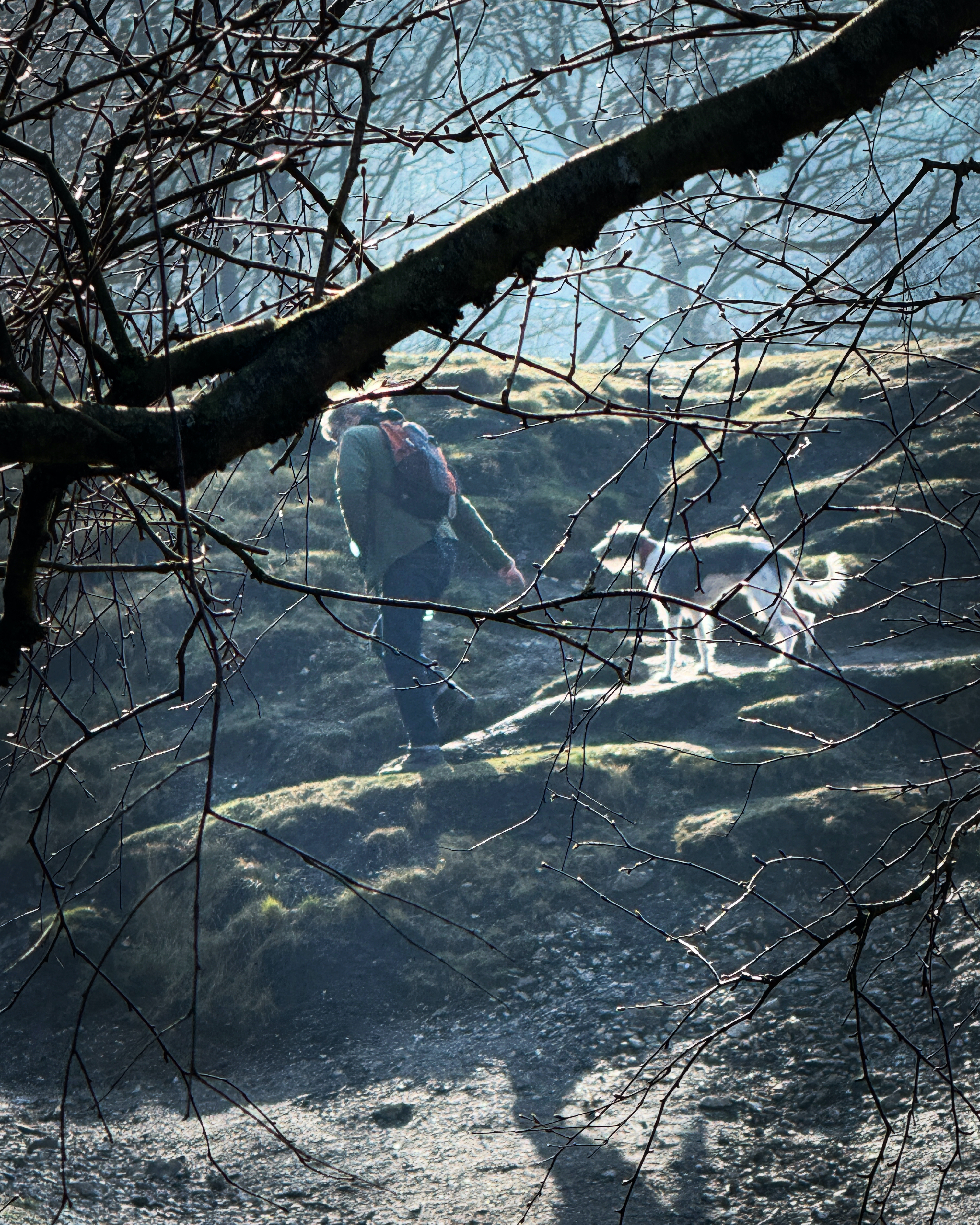 We were heading down, me and my friend, squeezing through narrow gaps, brought low by swaying branches, clipped by thorns. I looked up and caught a glimpse through the trees across a gap in the leaves – the ghost of a dog and its owner, backlit by the sun, delineated by sparks against the background.
